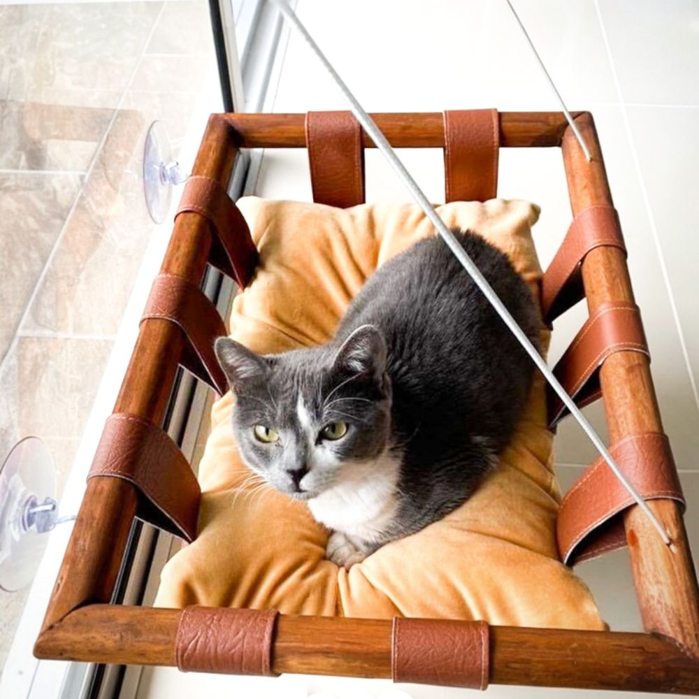 Nuestra hamaca especialmente diseñada para su comodidad y descanso convierte cualquier ventana en el lugar favorito de tu gato. Su marco de madera natural aporta elegancia y resistencia, mientras que el cojín central, sostenido por tiras de cuerina reforzadas con velcro, ofrece un soporte seguro y al mismo tiempo fácil de desmontar y lavar. Ideal para instalar en ventanas, esta cama elevada no solo le regala un espacio acogedor, sino también un mirador perfecto para observar el mundo exterior, algo que todo gato adora. Su diseño combina estética y funcionalidad, con un tamaño ideal de 50 cm de largo por 35 cm de ancho, lo que la convierte en una opción práctica para cualquier hogar.