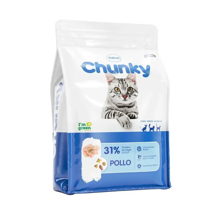 Con Chunky Gatos Pollo cada bocado es una explosión de sabor real que conquista hasta al paladar felino más exigente. Preparado con pollo de la mejor calidad, este alimento no solo es delicioso, también le brinda la nutrición equilibrada que necesita para mantenerse lleno de energía, con un pelaje brillante y una vitalidad que se nota día a día. Su textura jugosa y su aroma irresistible convierten la hora de comer en un momento de pura emoción.