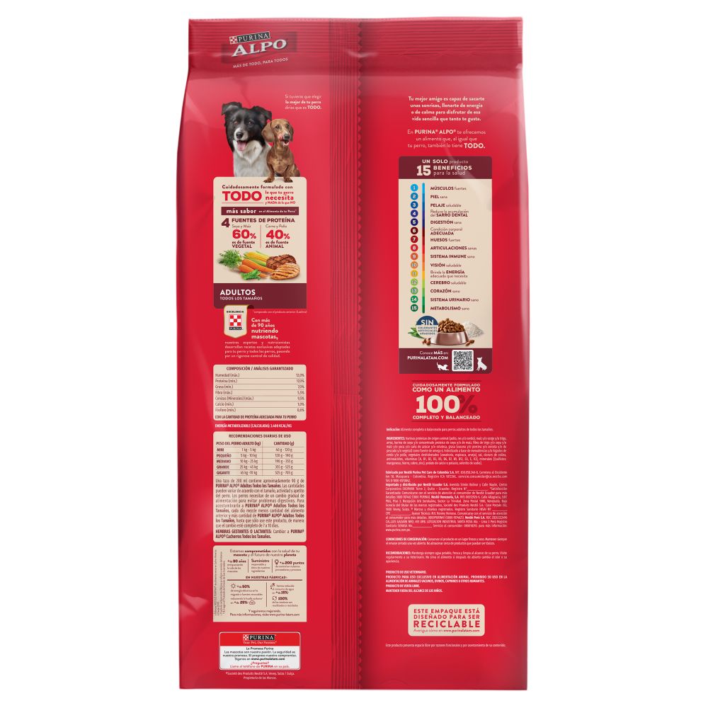 Purina Alpo está formulado para ofrecer a los perros adultos de todos los tamaños una dieta completa y balanceada, hecha con ingredientes de alta calidad que garantizan el sabor irresistible que tanto disfrutan y los nutrientes esenciales que realmente necesitan. Cada croqueta de Purina Alpo ha sido diseñada para brindar proteínas que fortalecen los músculos, vitaminas y minerales que cuidan su vitalidad y un nivel óptimo de nutrientes que favorecen una vida larga y saludable. Es el equilibrio perfecto entre sabor y nutrición, porque entendemos que la hora de la comida no solo es un momento para alimentarse, sino también para compartir felicidad y bienestar con tu mejor amigo.