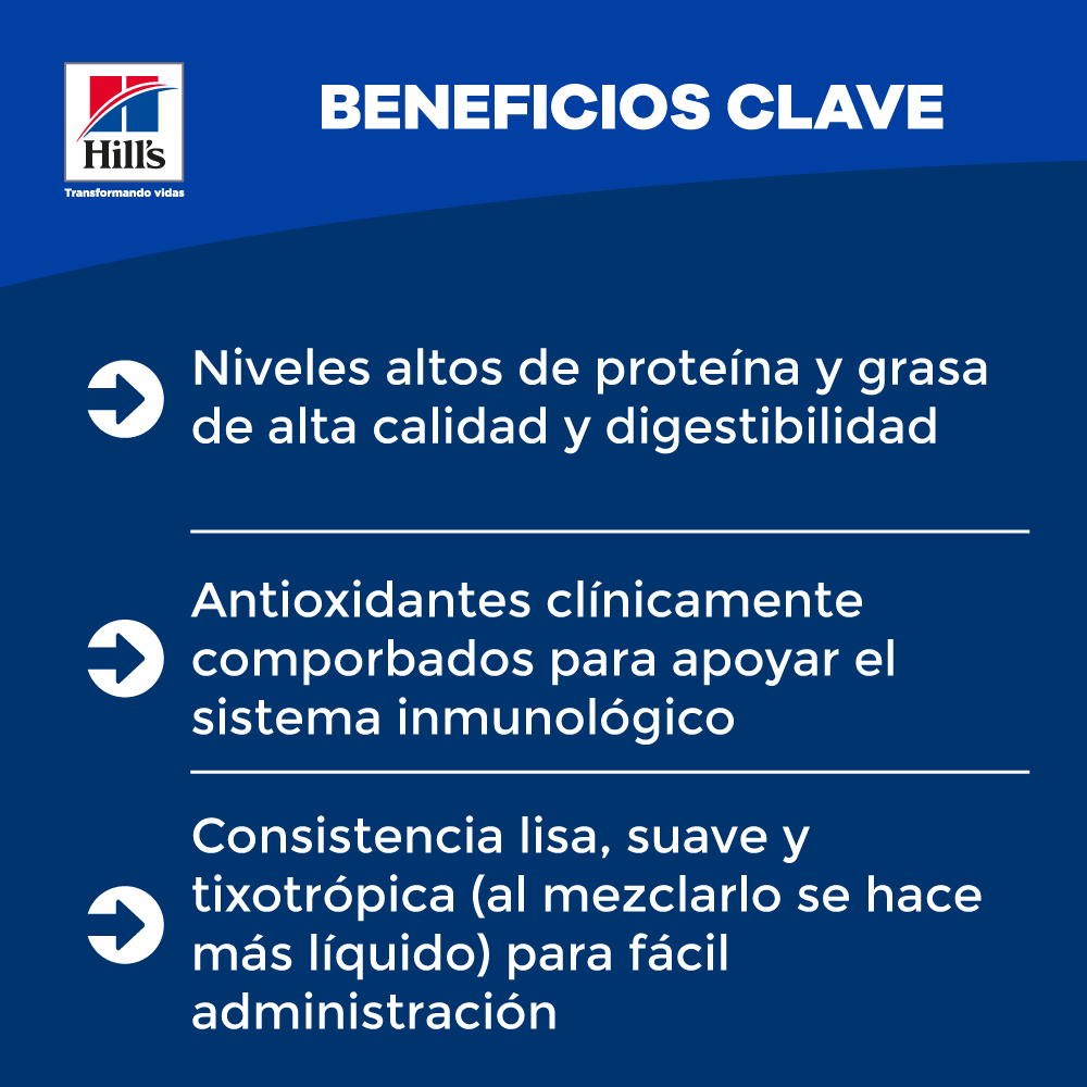 Hill's Prescription Diet a/d Alimento Húmedo ha sido clínicamente formulado para brindar el soporte nutricional que perros y gatos requieren en su proceso de recuperación después de una cirugía, con una textura suave, altamente palatable y fácil de consumir incluso para aquellos con poco apetito. Cada lata está elaborada con proteínas de alta calidad y nutrientes esenciales que favorecen la cicatrización, fortalecen el sistema inmune y devuelven la energía que tu compañero necesita para volver a sentirse bien. Es más que un alimento: es un aliado en uno de los momentos más importantes de su vida.