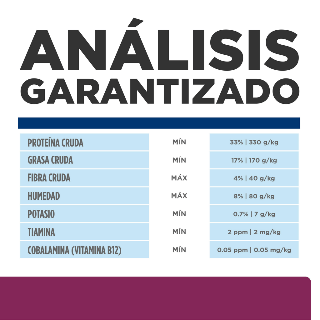 Pollo, cebada perlada partida, harina de gluten de maíz, grasa de pollo, arroz cervecero, producto de huevo, maíz integral, harina de pollo, sabor a hígado de pollo, ácido láctico, sulfato de calcio, pulpa de remolacha deshidratada, cloruro de potasio, cloruro de colina, fructooligosacáridos (FOS) , vitaminas (suplemento de vitamina E, suplemento de niacina, mononitrato de tiamina, L-ascorbilo-2-polifosfato (fuente de vitamina C), pantotenato de calcio, suplemento de vitamina A, suplemento de riboflavina, biotina, clorhidrato de piridoxina, suplemento de vitamina B12, ácido fólico, vitamina Suplemento D3), taurina, DL-metionina, sal yodada, L-lisina, cáscara de semilla de psyllium, minerales (sulfato ferroso, óxido de zinc, sulfato de cobre, óxido de manganeso, yodato de calcio, selenita de sodio), tocoferoles mixtos para la frescura, sabores naturales, Óxido de Magnesio, Betacaroteno.