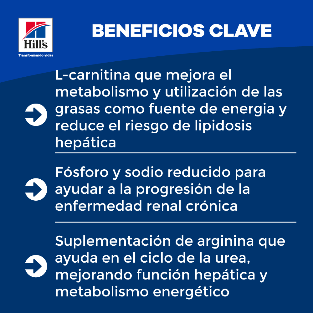 Su receta ha sido cuidadosamente diseñada para gatos adultos con insuficiencia renal crónica o temporal, aportando nutrientes que reducen la carga de trabajo de los riñones y favorecen su bienestar diario. Con un sabor delicioso a pollo, logra que tu gato disfrute de su alimento mientras recibe el cuidado médico-nutricional que realmente necesita. Con Hill’s k/d no solo nutres a tu gato, le das la oportunidad de vivir mejor, tener mejor calidad de vida y tenerlo más tiempo a tu lado.